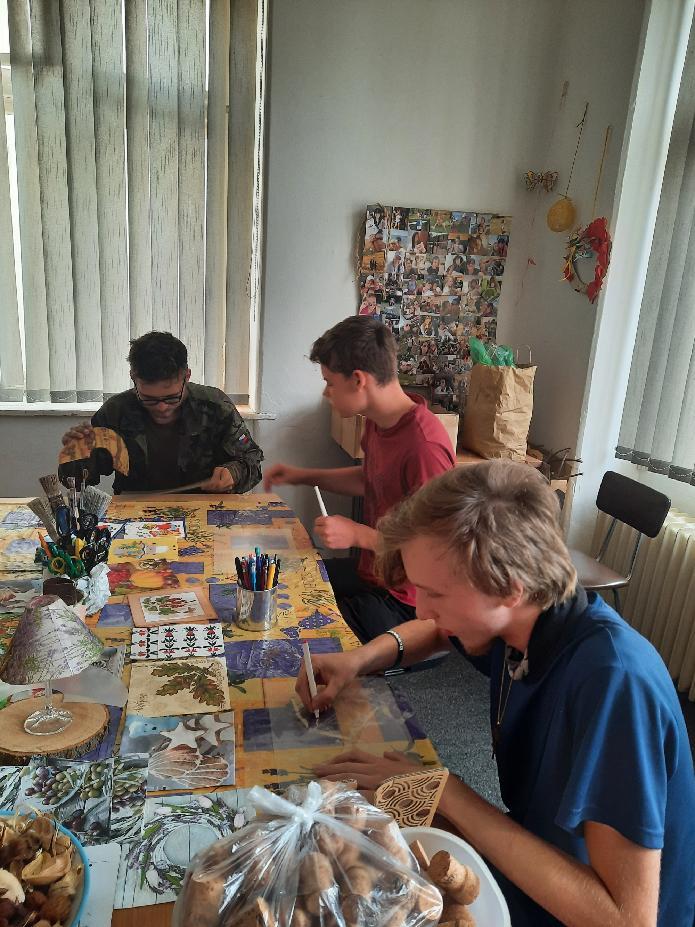 V září jsme se vrhli do tvoření rovnýma nohama. Dny se krátí, a tak jsme udělali roztomilou a skoro až romantickou lampičku. K práci jsme potřebovali plastovou podložku, kterou jsme vystřihli do tvaru půlkruhu, ubrousek, lepidlo a tavnou pistoli. Na vystřižený půlkruh jsme nalepili ubrousek, stočili do tvaru stínítka a tavkou slepili. No a po zaschnutí jen umístili na skleničku s nožkou. Na závěr stačilo vložit světýlka a bylo hotovo. Všem se moc povedlo a samozřejmě byla pohoda i legrace.