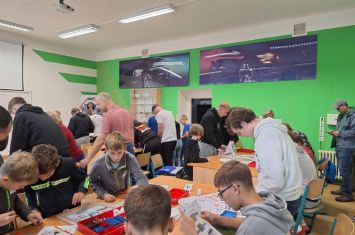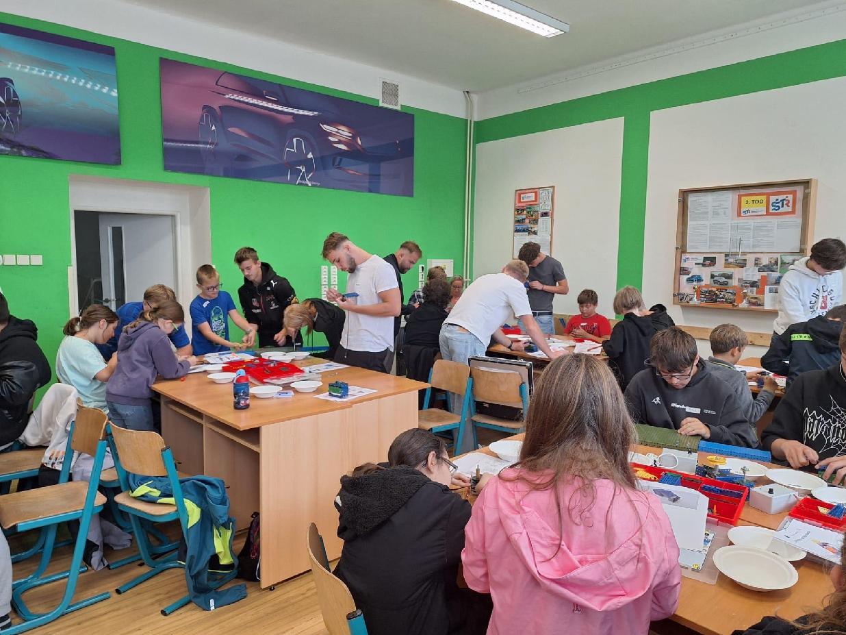 V rámci spolupráce s Krajskou hospodářskou komorou jsme opět uspořádali na naší škole soutěž ve stavění modelu z polytechnické stavebnice MERKUR. Soutěž byla zaměřena na technickou tvorbu a rozvoj jemné motoriky. Šestičlenné týmy tvořily vždy 3 studenti 2. ročníku (obor Dopravní prostředky) a 3 žáci základních škol z blízkého okolí (ZŠ Klicperova Nový Bydžov, ZŠ Karla IV. Nový Bydžov, ZŠ Chlumec nad Cidlinou, ZŠ Smidary a ZŠ Hlušice).