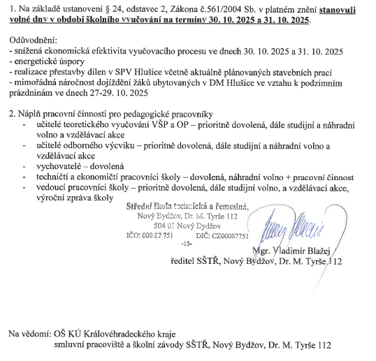 Stanovení volných dnů ředitelem školy (podzimní prázdniny)