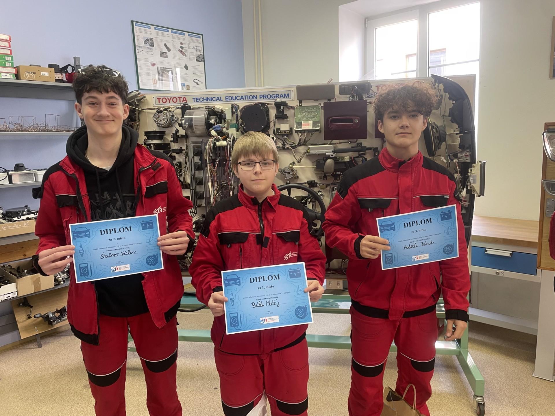 Dne 13. 11. 2025 ve středisku praktického vyučování na Masarykově náměstí došlo na první „testovací kolo“, kde v této disciplíně zabojovali žáci z prvního ročníku oboru Autoelektrikář. Tito žáci u nás studují již přes 2 měsíce, a tak ukázali svůj zápal pro tento obor a i znalosti, které u nás nasbírali. Ohodnotili jsme z celé třídy 1. AE 3 nejlepší mladé autodiagnostiky: