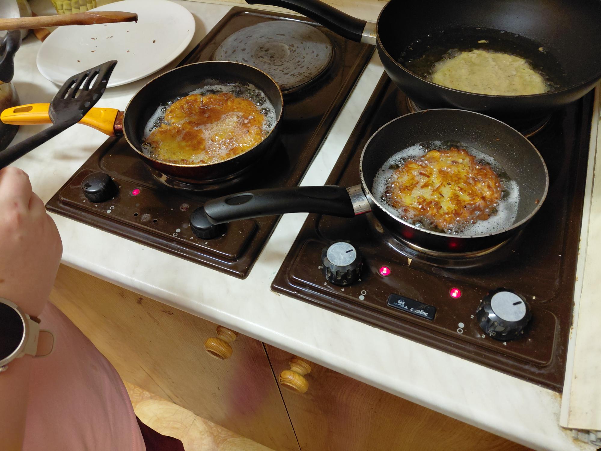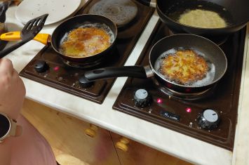 Smažení pak ovládla T. Hallová, která se u pánve proměnila v hlavní oporu celé akce. V obklopení prskajícího oleje trpělivě vyráběla jeden bramborák za druhým a zvládala i narůstající tlak hladového publika.