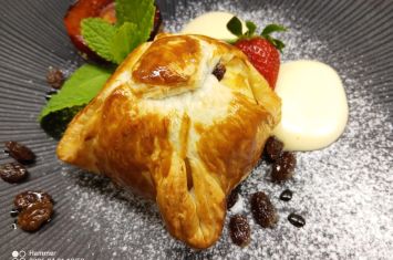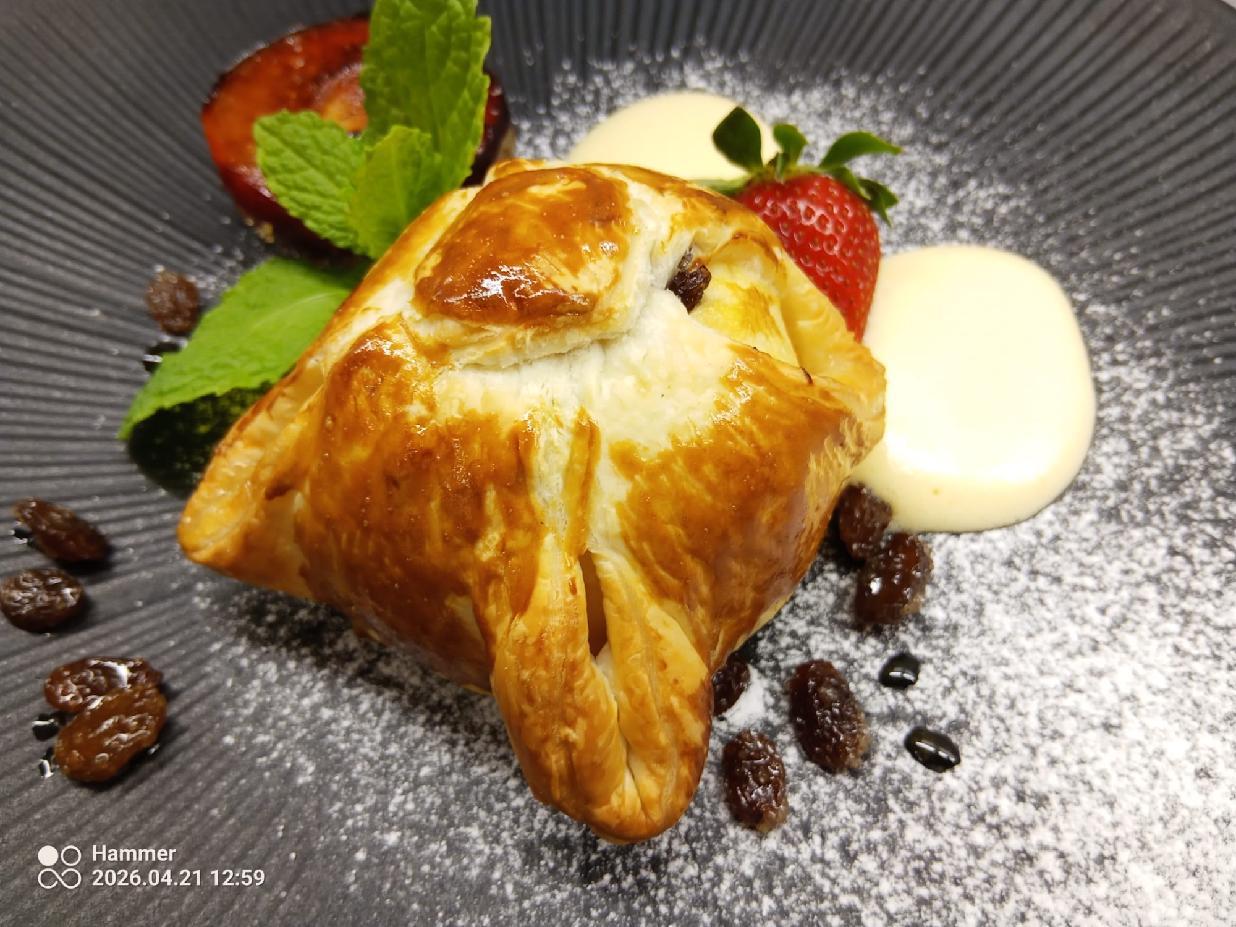 Sladkou tečkou byl dezert jablko v županu s vanilkovou pěnou, nočky ze zakysané smetany a nakládaná švestka v brandy, který vhodně završil celkový gastronomický dojem.