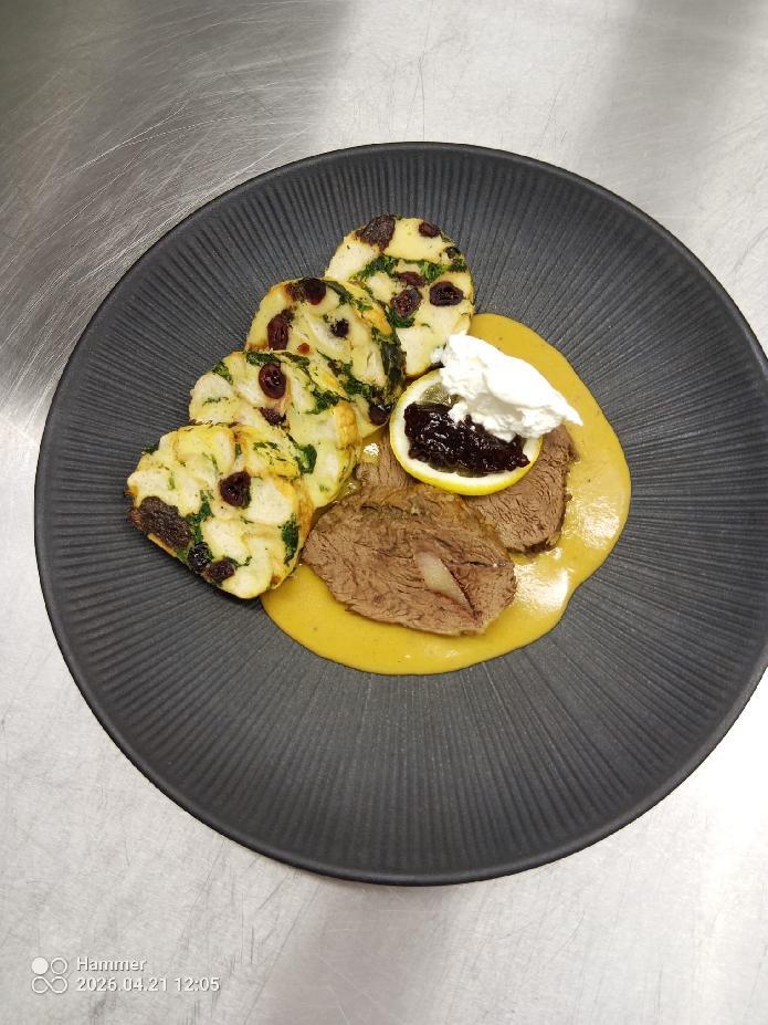 Hlavní chod představovala pečená jelení kýta se svíčkovou omáčkou, doplněná karlovarským knedlíkem s baby špenátem, brusinkovým terčem a šlehačkou. Právě svíčková omáčka se stala podle hodnocení odborníků vrcholem celého menu a získala nejvyšší ocenění.